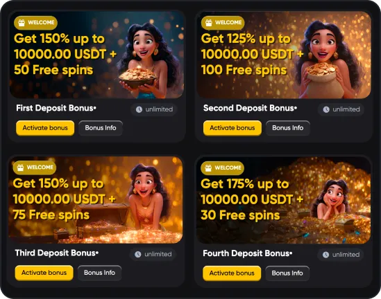 | Fourth deposit bonus | Get 175% up to 10000 USDT / 10000 EUR / 7300 GBP / 15000 AUD + 30 Free Spins | 100 USDT / 100 EUR / 80 GBP / 150 AUD |